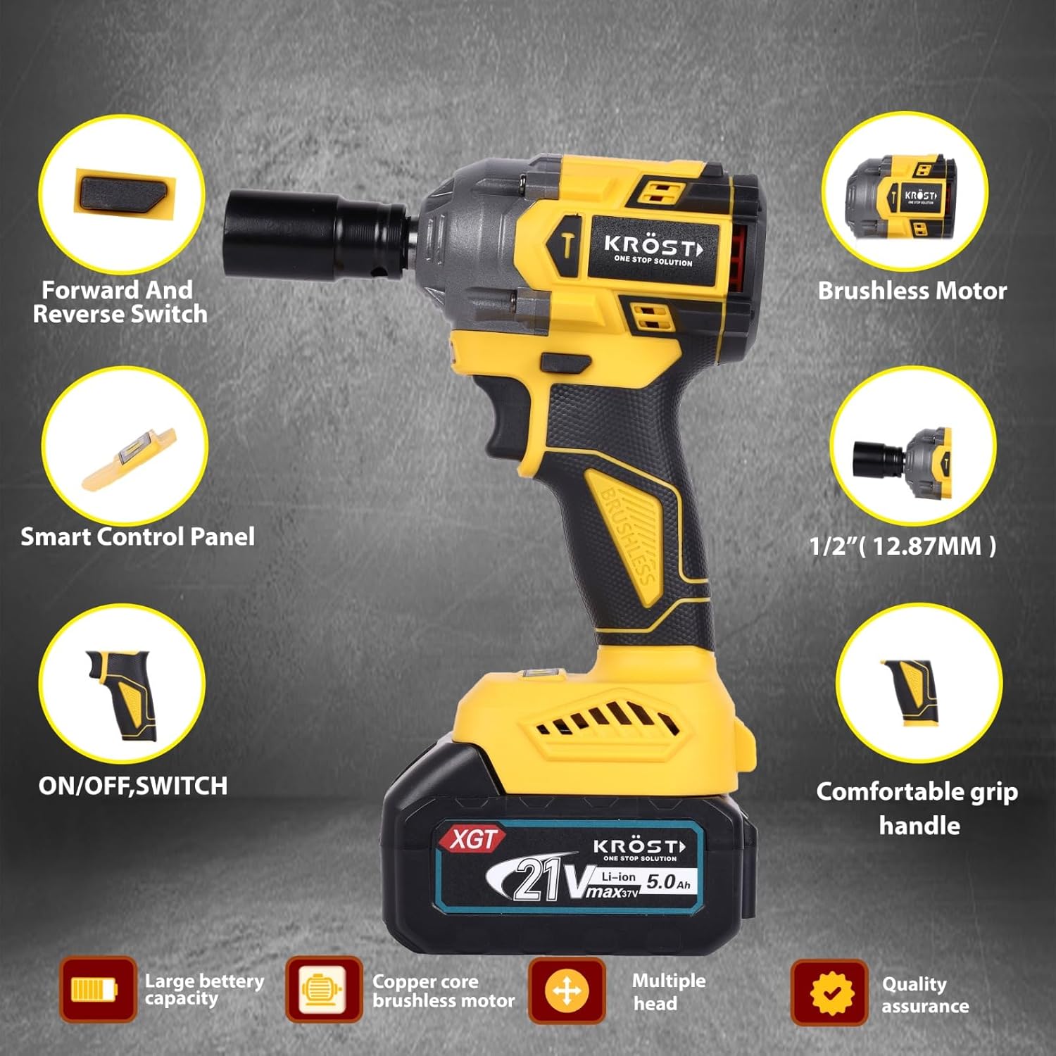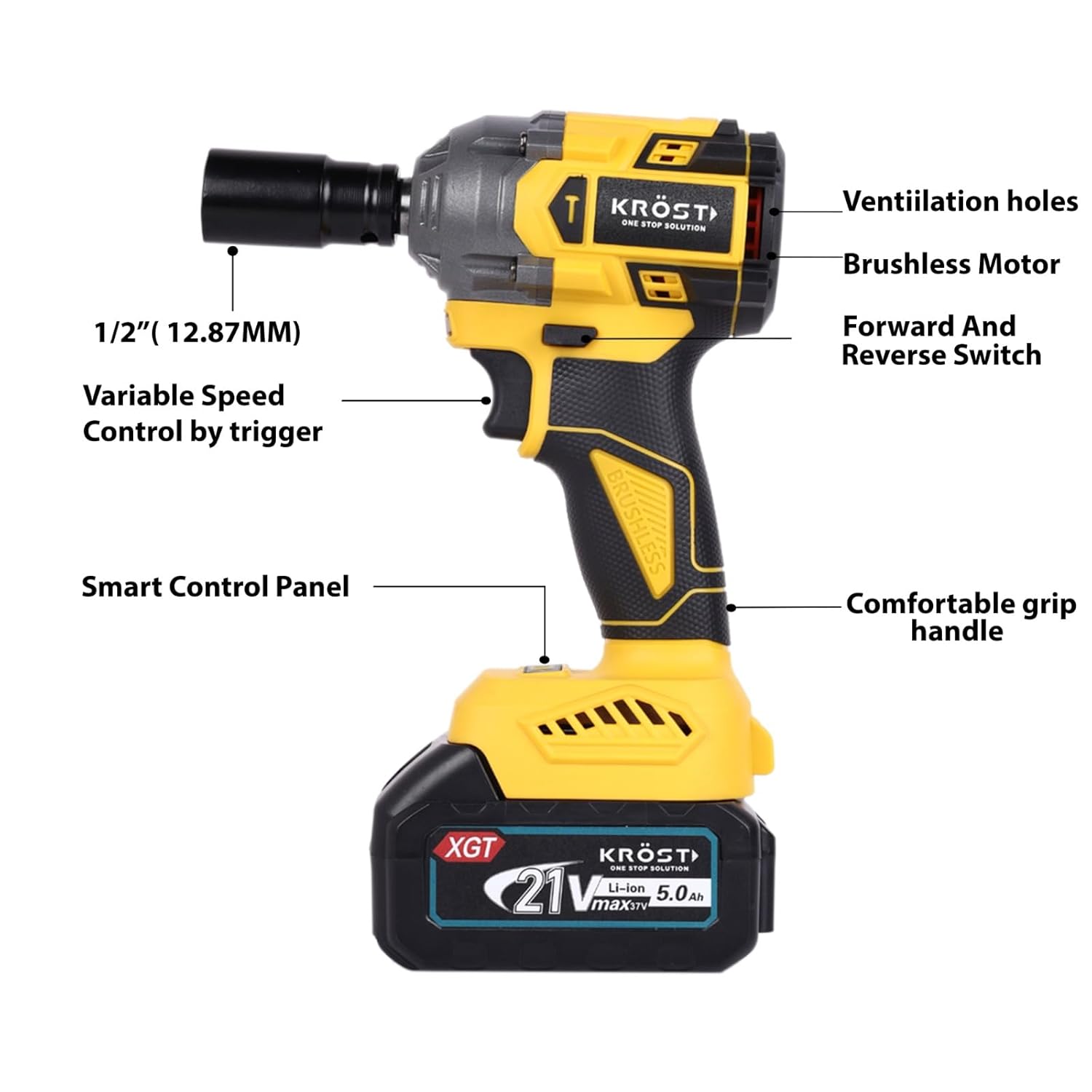 KROST Pro Series 500NM XR Torque Cordless Brushless Impact Wrench, Super Compact,Auto Stop Function, Forward/Reverse Rotation (Double Batteries)