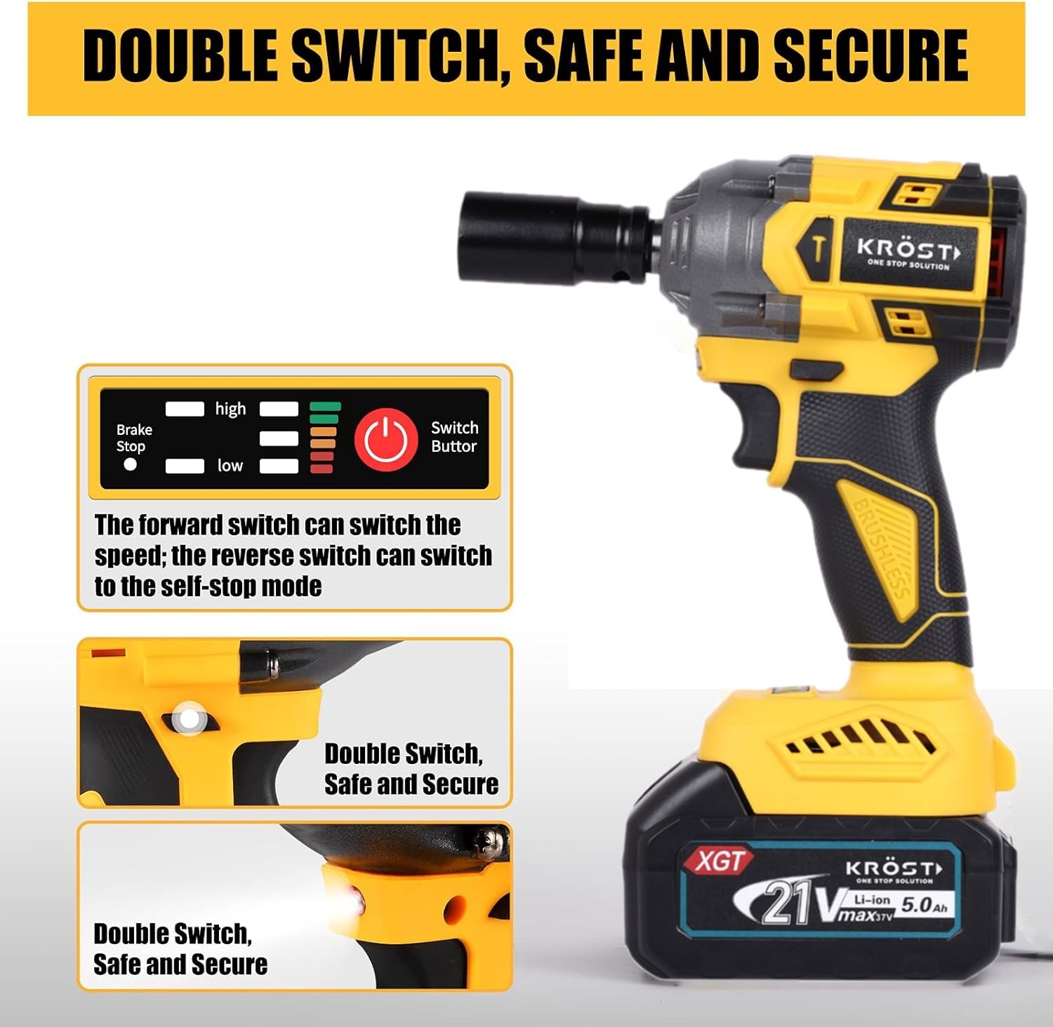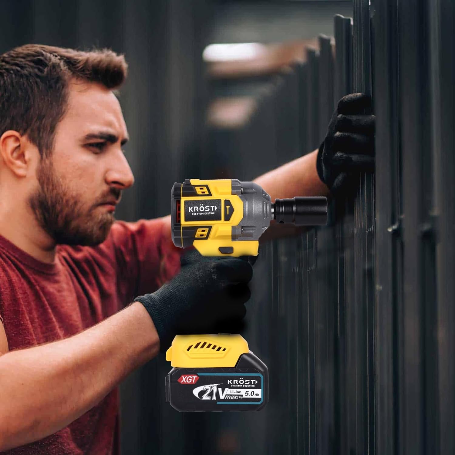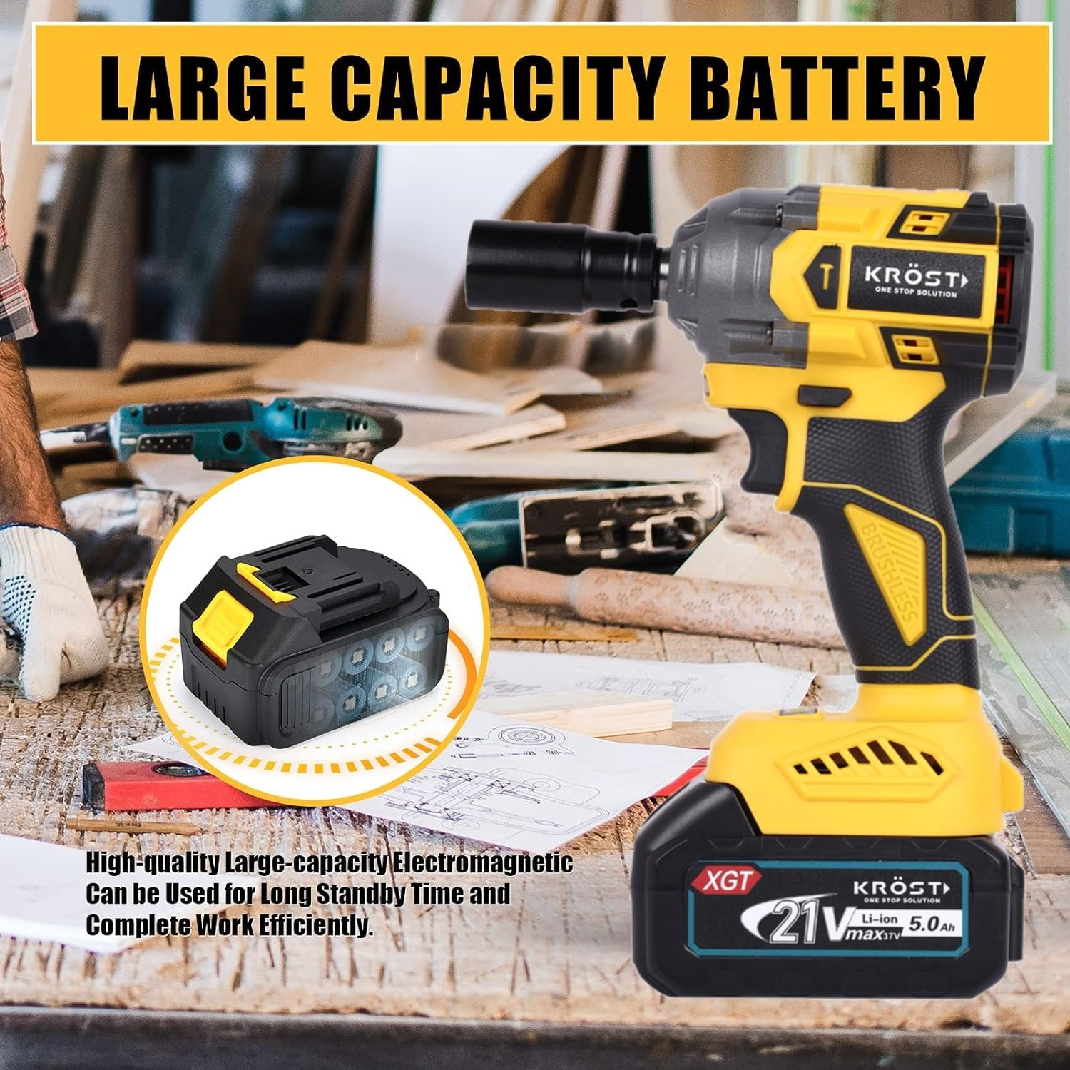 KROST Cordless impact wrench 1/2" inch 500nm(370 ft-lbs) breakaway torque, easily removing stubborn bolts and fasteners. It Can be applied to tire demolition, auto repair, machine repair, pipe repair, scaffolding and construction work, etc.