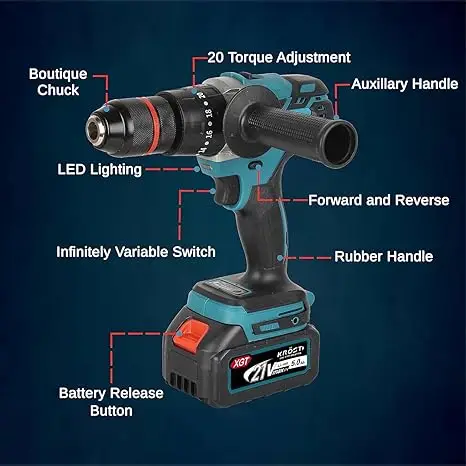 Package Includes 5.0Ah 21V(37V MAX) Batteries * 1, Cordless Drill Machine *1 Quick Charger * 1, Belt Buckle, User Manual. To meet different needs on the job, provide precise control for drilling wood, metal, plastic and cement. And use a hard box to place, carry.