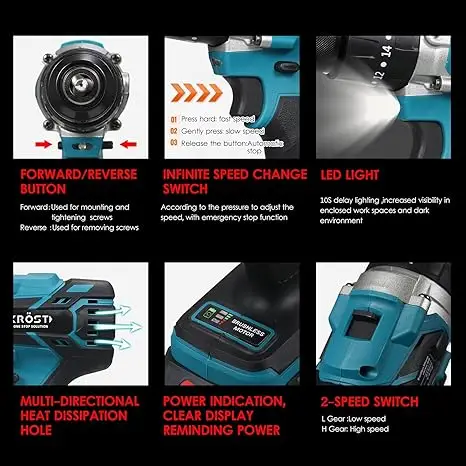Compared with 3/8″ plastic chuck, 1/2”keyless metal ratcheting chuck owns excellent performance in providing maximum accessory compatibility and durability; Forward/reserve switch of this drill driver is available for drilling and fastening, allows you to either screw or replace/remove bits according to your needs