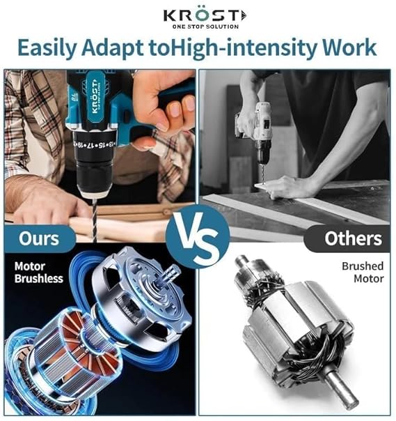 【Cordless Hammer Drill With Brushless Motor】 This KROST hammer drilling machine features hammer drilling, drilling, Hammer mode for drilling in concrete or stone; Drilling mode for drilling without impact in wood, metal, ceramic and plastic as well as for screw-driving;Brushless Motor and 3/8-Inch Keyless Metal Chuck] The KROST cordless drill has a maximum torque of 50NM.