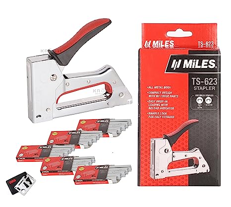 Miles Metal Body TS-623 Staple Gun Tacker With 5000 Staples (Medium, Red) is a tough, lightweight stapler for upholstery and woodwork. The ergonomic design ensures user comfort, while the included staples enable long-lasting performance in both home improvement and workshop settings.