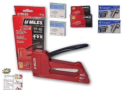 Miles TP-10 Gun Tacker, Sofa Stapler with 23/6 (2000 pcs), 23/8 (2000 pcs), 23/10 (2000 pcs) Staples is a complete set for everyday stapling needs. The included staples cover multiple depths, and the stapler provides firm, easy fastening. Ideal for home use, crafting, and furniture touch-ups.
