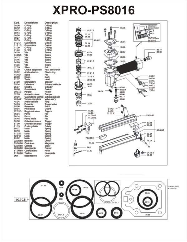 The OM XPRO-8016 is a robust pneumatic stapler featuring a 145-staple capacity magazine, metal internal parts, and long-lasting twin piston rings for extended tool life. It includes a rear exhaust with silencer, ergonomic rubber grip, and a safety trigger for controlled operation. Ideal for precise and efficient stapling with 4–16 mm fasteners at 70–90 PSI.