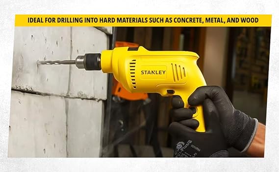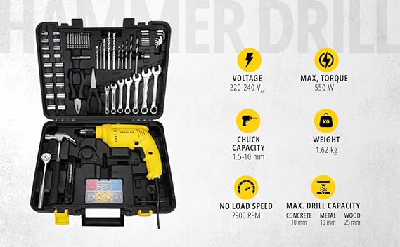 STANLEY SDH550KM-IN 550W 10mm Corded Single Speed Hammer Drill Machine with Mechanical Hand Toolkit (120-Pieces) - Includes Hammer Drill, Measuring Tape, Hammer, 1 Year Warranty, YELLOW & BLACK