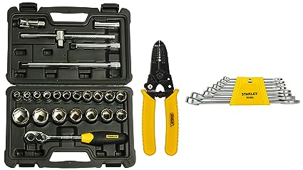 STANLEY SQ. Drive Metric 1/2'' 6 Point Socket Set (24-Pieces) & Chrome Vanadium Steel Combination Spanner Set (8-Pieces) & 150mm/6'' Wire Stripper with Cutting Edge Yellow