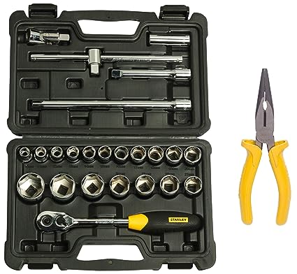 STANLEY STMT72795-8 SQ. Drive Metric 1/2'' 6 Point Socket Set (24-Pieces) & STANLEY 70-462 6'' Sturdy Steel Long Nose Plier Single Color Sleeve