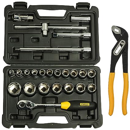 STANLEY STMT72795-8 SQ. Drive Metric 1/2'' 6 Point Socket Set (24-Pieces) & STANLEY 71-669 10'' Water Pump Plier Box Joint,Curve Steel