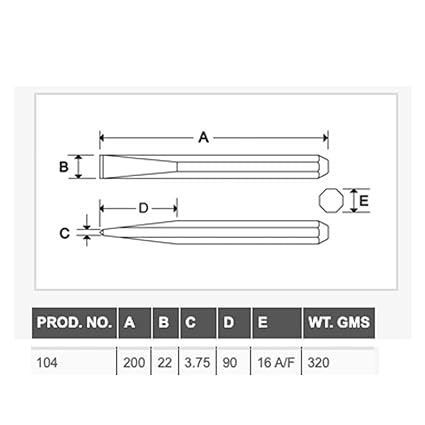 Scientifically hardened and tempered to ensure best combination of hardness and toughness.Has a octagonal body which facilitates comfortable holding .Phosphated and painted to prevent from rust and also increase life of the chisel.